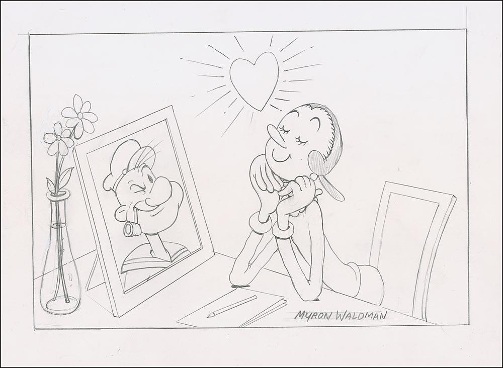 Original signed pencil sketch of Olive Oyl pining over a photo of Popeye on a white 14 x 10.25 card. In fine condition with a few creases to the upper left corner.