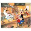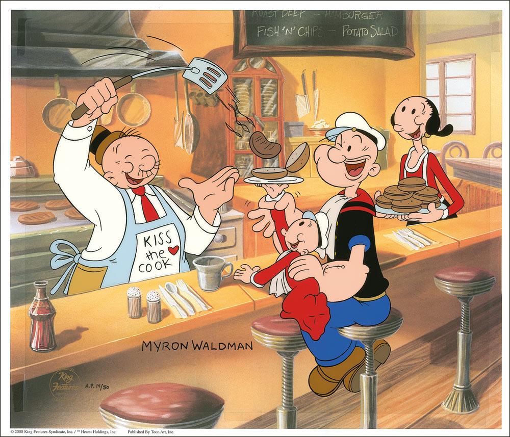 Limited edition hand-painted animation cel, #AP 14/50, entitled ‘Orders Up,’ 12.5 x 9, showing Popeye, Olive, and Swee’Pea watching Wimpy flipping burgers, signed in black felt tip by Waldman, and set against a pre-printed color background. In very fine condition.