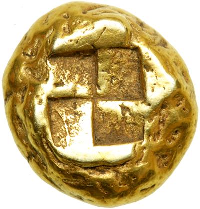 Mysia, Kyzikos, c. 400 BC. Electrum Stater (16.0 g). Head right of bearded Herakles wearing lion's skin headdress; below, tunny fish swimming to right. Reverse: Quadripartite incuse square. Boston MFA 1526; von Fritze 140. Well centered. Very Fine.
