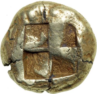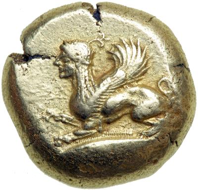 An extremely well-detailed stater showing a remarkable facial rendering of an archaic sphinx.