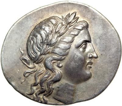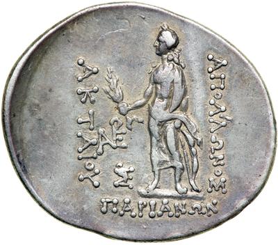 Mysia, Parion, c. 160 BC. AR Tetradrachm (16.64 g). Laureate head right of Apollo. Reverse: Apollo Aktaios standing left, holding branch in right hand and resting left hand on bow; in left field, two monograms. Cf. Meadows (Greek Coins in the British Museum, NC 1998) p. 42, 2, and pl. 15, 11. Unpublished variant. Nicely toned. Nearly Extremely Fine.
