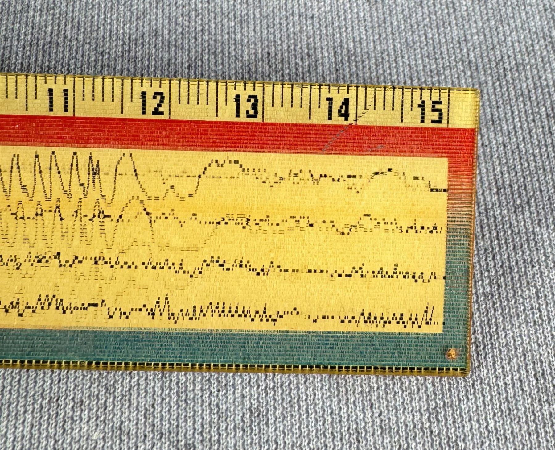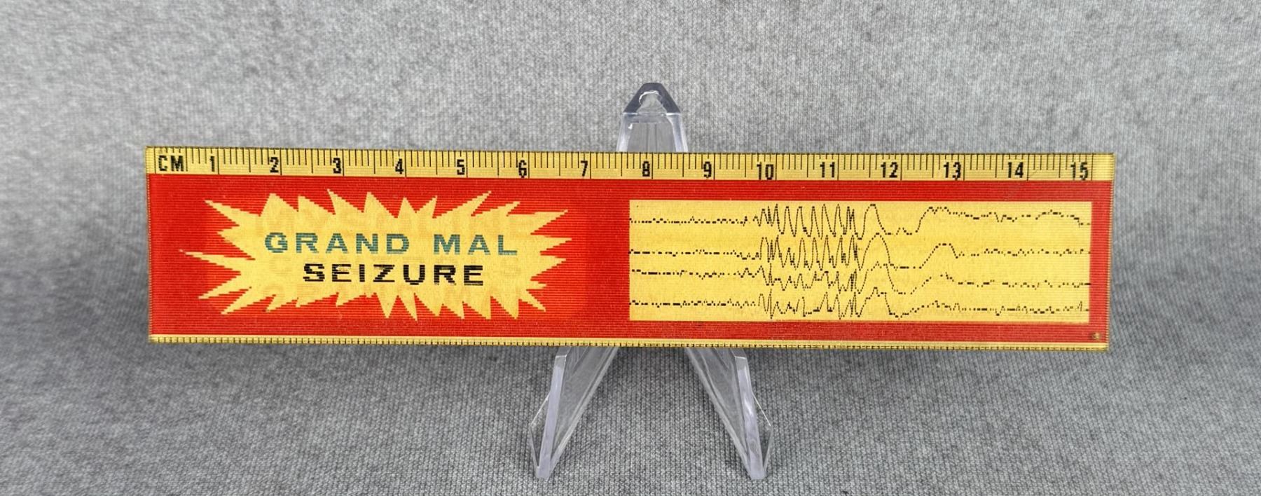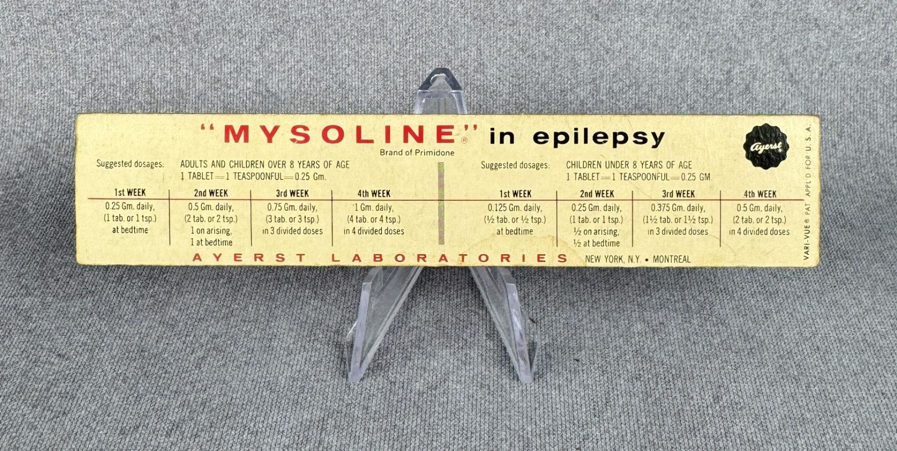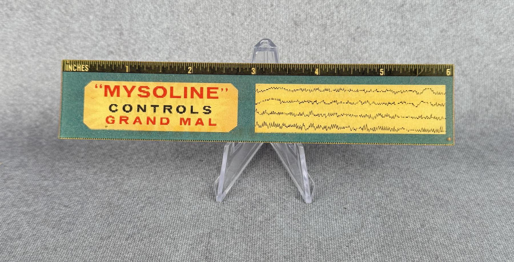 Mysoline by Primidone, 6" by 1 1/4". Borderline a cruel joke as the lenticular nature of this ruler causes sudden changes in colors and patterns, which would have been Seizure inducing.