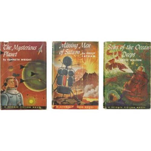 <B>Three Science Fiction First Editions Published by John Winston</B></I>. All volumes published Philadelphia Toronto: The John C. Winston Company, including: <B>Kenneth Wright [pseudonym for Lester del Rey]. </B></I><B><I>The Mysterious Planet</B></I></B></I>. [1953]. First edition. Octavo. 209 pages. Publisher's red cloth with yellow spine titles. In original pictorial dust jacket. One small chip at the top of the front panel, else very good condition. [and:] <B>Bryce Walton. </B></I><B><I>Sons of the Ocean Deeps</B></I></B></I>. [1952]. First edition. Octavo. 216 pages. Publisher's light blue cloth with dark blue spine titles. In original pictorial dust jacket (price-clipped). Some minor chipping to the dust jacket edges, including a small open tear at the top, front flap fold, else very good condition. [and:] <B>Philip Latham. </B></I><B><I>Missing Men of Saturn</B></I></B></I>. [1953]. First edition. Octavo. 215 pages. Publisher's red cloth with black spine titles. In original pictorial dust jacket. Four small open tears along the dust jacket edges, else a very good copy. A handsome set of Atomic-era science fiction novels. <I>From the Robert and Diane Yaspan Collection.</B></I><BR><BR><b>Shipping:</b> Books & Catalogs (<a target="_blank" href="http://www.heritageauctions.com/common/shipping.php">view shipping information</a>)