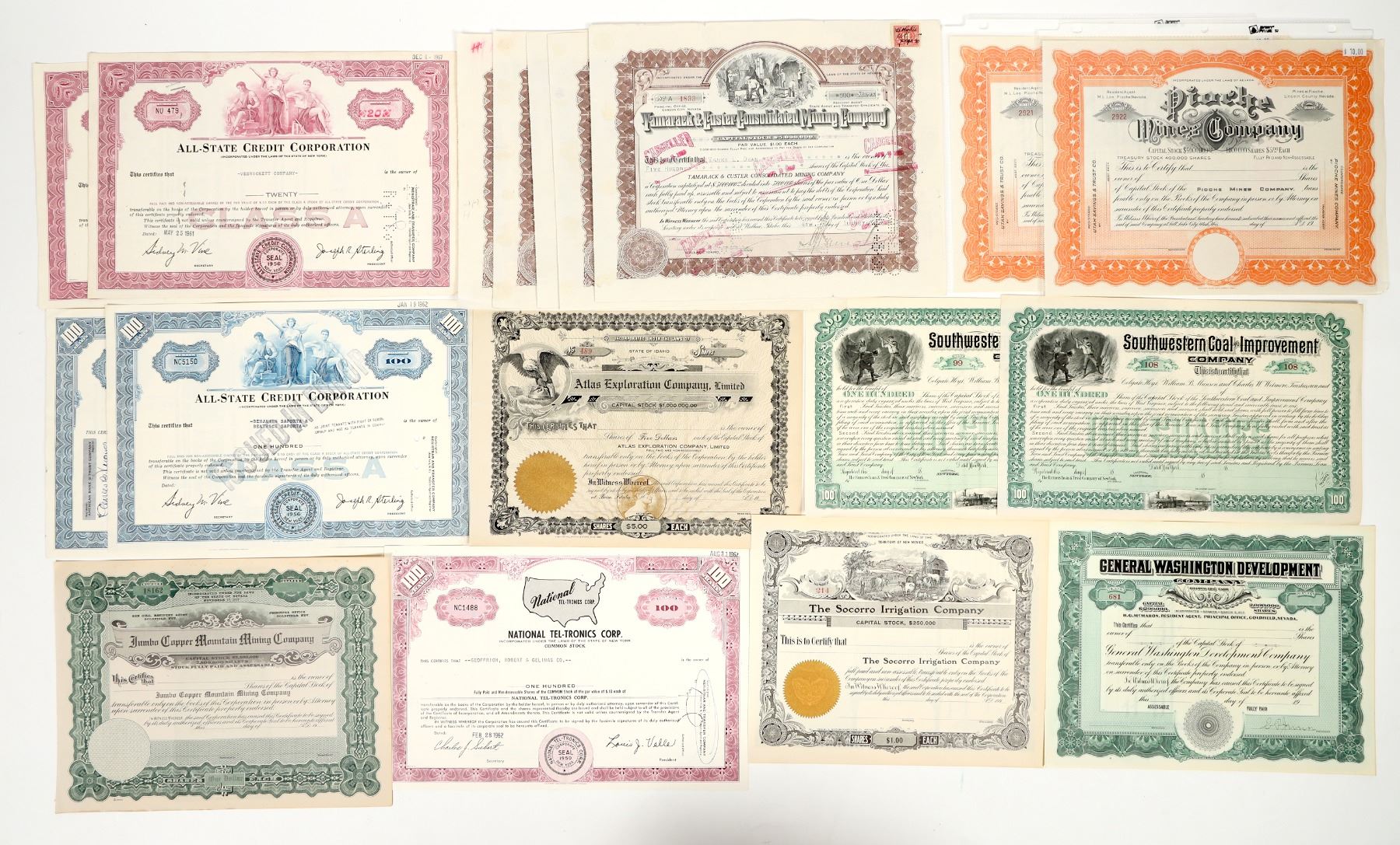 Lot of 112. U/U/U/C/ I/U, I/C. Mix of industries. Issued between 1902-62. Various cond.. U.E; of companies :Unit Petroleum Corp, Pennzoil United, Inc., Lehigh Coal and Navigation Co. , All-State Credit Corp., Southwestern Coal and Improvement Co., General Washington Development Co.