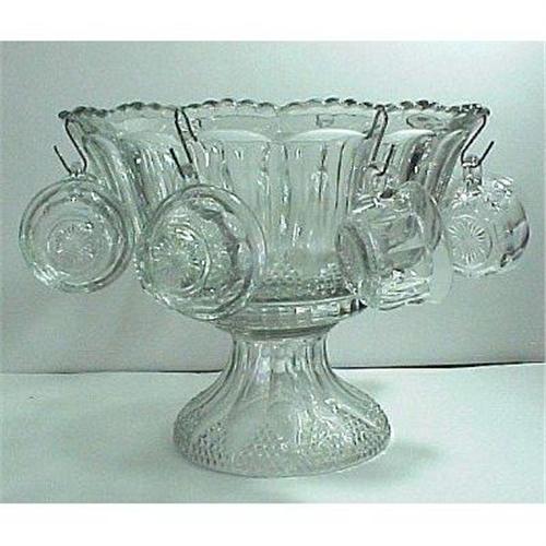 <p> This punch bowl set has a button arch design. The bowl is 14 1/2 inches wide and 7 inches deep. The pedestal stand is 6 inches tall. There are 9 matching cups with 9 early twisted wire punch cup hooks. This very impressive set stands just under 20 inches tall when together. One of the cups has a small chip to the rim. There is no other damage to the set. <p>This is a beautiful impressive antique punch bowl set which would grace any holiday table.