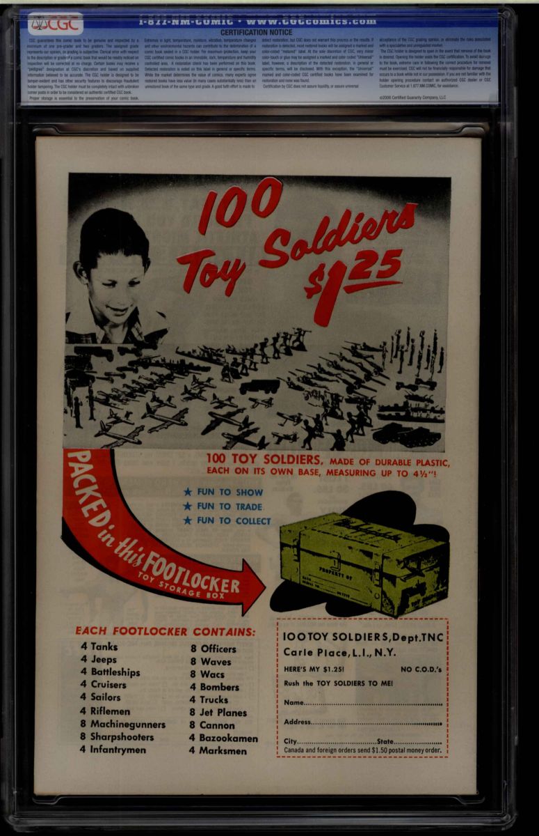 The Auctioneer has reserved the right to reject any and all bids, and to bid at the auction. Auctioneers Auctions are not on approval. Auctioneer does not allow certified material to be returned because of possible differences of opinion with respect to the grade offered by any third party organization, dealer, or service. Absolutely no guarantee of grade is offered for un-certified property sold and subsequently submitted to a third-party grading service. There will be no exceptions to this policy. Under extremely limited circumstances, (e.g. gross cataloging error) a purchaser, who did not bid from the floor, may request Auctioneer to evaluate voiding a sale; such request must be made in writing detailing the alleged gross error, and submission of the lot to the Auctioneer must be pre-approved by the Auctioneer. Bidder must notify Auctioneer in writing of such request within three (3) days of the non-floor bidder receipt of the lot. Any lot that is to be evaluated must be in our offices within 30 days after Auction. Grading does not qualify for this evaluation process nor do such complaints constitute a basis to challenge the authenticity of a lot. AFTER THAT 30-DAY PERIOD, NO LOTS MAY BE RETURNED FOR REASONS OTHER THAN AUTHENTICITY. Lots returned must be housed intact in the original holder. No lots purchased by floor Bidders may be returned (including those Bidders acting as agents for others). Late remittance for purchases may be considered just cause to revoke all return privileges. B: Auctions conducted solely on the Internet have a THREE (3) DAY RETURN POLICY: Lots paid for within seven days of the Auction closing are sold with a three (3) day return privilege. You may return lots under the following conditions: Within three days of receipt of the lot, you must first notify Auctioneer by contacting Client Service by phone (314-680-8599) or e-mail (moundcityauctions@gmail.com), and immediately mail the lot(s) fully insured to the attention of Returns, Mound City Auctions 1081 Teson Rd. Hazelwood, MO. 63042. Lots must be housed intact in their original holder and in their original condition. You are responsible for the insured, safe delivery of any lots. Auctioneer will not be responsible for lots returned in non-registered mail or lots returned without prior authorization per section B. A non-negotiable return fee of 5% of the purchase price ($10 per lot minimum) will be deducted from the refund for each returned lot or billed directly. Postage and handling fees are not refunded. After the three-day period (from receipt), no items may be returned for any reason. Late remittance for purchases revokes all Return-Restock privileges. C: Bidders who have inspected the lots prior to the auction will not be granted any return privileges. D: Comic books sold referencing a third-party grading service are sold “as is” without any express or implied warranty. Certain warranties may be available from the grading services and the Bidder is referred to them for further details: Certified Guaranty Company, LLC. (CGC), P.O. Box 4738, Sarasota, FL 34230. E: Bidders who intend to challenge authenticity or provenance of a lot must notify Auctioneer in writing within thirty (30) days of the Auctions conclusion. In the event Auctioneer cannot deliver the lot or subsequently it is established that the lot lacks title, provenance, authenticity, or other transfer or condition issue is claimed, Auctioneer's liability shall be limited to rescission of sale and refund of purchase price; in no case shall Auctioneer's maximum liability exceed the high bid on that lot, which bid shall be deemed for all purposes the value of the lot. After one year has elapsed, Auctioneer's maximum liability shall be limited to any commissions and fees Auctioneer earned on that lot. F: All comics are guaranteed genuine, but are not guaranteed as to grade, since grading is a matter of opinion, an art and not a science, and therefore the opinion rendered by the Auctioneer or any third party grading service may not agree with the opinion of others (including trained experts), and the same expert may not grade the same item with the same grade at two different times. G: Since we cannot examine encapsulated comics, they are sold “as is”without our grading opinion, and may not be returned for any reason. Auctioneer shall not be liable for any patent or latent defect or controversy pertaining to or arising from any encapsulated collectible. In any such instance, purchaser's remedy, if any, shall be solely against the service certifying the collectible. H: Due to changing grading standards over time, differing interpretations, and to possible mishandling of items by subsequent owners, Auctioneer reserves the right to grade items differently than shown on certificates from any grading service that accompany the items. Auctioneer also reserves the right to grade items differently than the grades shown in the prior catalog should such items be reconsigned to any future auction. I: Although consensus grading is employed by most grading services, it should be noted as aforesaid that grading is not an exact science. In fact, it is entirely possible that if a lot is broken out of a plastic holder and resubmitted to another grading service or even to the same service, the lot could come back with a different grade assigned. J: Certification does not guarantee protection against the normal risks associated with potentially volatile markets. The degree of liquidity for certified collectibles will vary according to general market conditions and the particular lot involved. For some lots there may be no active market at all at certain points in time."