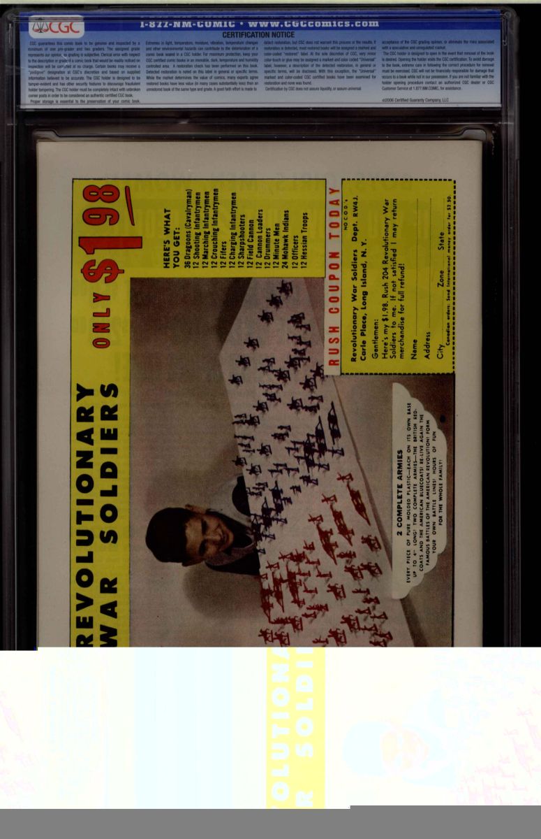 The Auctioneer has reserved the right to reject any and all bids, and to bid at the auction. Auctioneers Auctions are not on approval. Auctioneer does not allow certified material to be returned because of possible differences of opinion with respect to the grade offered by any third party organization, dealer, or service. Absolutely no guarantee of grade is offered for un-certified property sold and subsequently submitted to a third-party grading service. There will be no exceptions to this policy. Under extremely limited circumstances, (e.g. gross cataloging error) a purchaser, who did not bid from the floor, may request Auctioneer to evaluate voiding a sale; such request must be made in writing detailing the alleged gross error, and submission of the lot to the Auctioneer must be pre-approved by the Auctioneer. Bidder must notify Auctioneer in writing of such request within three (3) days of the non-floor bidder receipt of the lot. Any lot that is to be evaluated must be in our offices within 30 days after Auction. Grading does not qualify for this evaluation process nor do such complaints constitute a basis to challenge the authenticity of a lot. AFTER THAT 30-DAY PERIOD, NO LOTS MAY BE RETURNED FOR REASONS OTHER THAN AUTHENTICITY. Lots returned must be housed intact in the original holder. No lots purchased by floor Bidders may be returned (including those Bidders acting as agents for others). Late remittance for purchases may be considered just cause to revoke all return privileges. B: Auctions conducted solely on the Internet have a THREE (3) DAY RETURN POLICY: Lots paid for within seven days of the Auction closing are sold with a three (3) day return privilege. You may return lots under the following conditions: Within three days of receipt of the lot, you must first notify Auctioneer by contacting Client Service by phone (314-680-8599) or e-mail (moundcityauctions@gmail.com), and immediately mail the lot(s) fully insured to the attention of Returns, Mound City Auctions 1081 Teson Rd. Hazelwood, MO. 63042. Lots must be housed intact in their original holder and in their original condition. You are responsible for the insured, safe delivery of any lots. Auctioneer will not be responsible for lots returned in non-registered mail or lots returned without prior authorization per section B. A non-negotiable return fee of 5% of the purchase price ($10 per lot minimum) will be deducted from the refund for each returned lot or billed directly. Postage and handling fees are not refunded. After the three-day period (from receipt), no items may be returned for any reason. Late remittance for purchases revokes all Return-Restock privileges. C: Bidders who have inspected the lots prior to the auction will not be granted any return privileges. D: Comic books sold referencing a third-party grading service are sold “as is” without any express or implied warranty. Certain warranties may be available from the grading services and the Bidder is referred to them for further details: Certified Guaranty Company, LLC. (CGC), P.O. Box 4738, Sarasota, FL 34230. E: Bidders who intend to challenge authenticity or provenance of a lot must notify Auctioneer in writing within thirty (30) days of the Auctions conclusion. In the event Auctioneer cannot deliver the lot or subsequently it is established that the lot lacks title, provenance, authenticity, or other transfer or condition issue is claimed, Auctioneer's liability shall be limited to rescission of sale and refund of purchase price; in no case shall Auctioneer's maximum liability exceed the high bid on that lot, which bid shall be deemed for all purposes the value of the lot. After one year has elapsed, Auctioneer's maximum liability shall be limited to any commissions and fees Auctioneer earned on that lot. F: All comics are guaranteed genuine, but are not guaranteed as to grade, since grading is a matter of opinion, an art and not a science, and therefore the opinion rendered by the Auctioneer or any third party grading service may not agree with the opinion of others (including trained experts), and the same expert may not grade the same item with the same grade at two different times. G: Since we cannot examine encapsulated comics, they are sold “as is”without our grading opinion, and may not be returned for any reason. Auctioneer shall not be liable for any patent or latent defect or controversy pertaining to or arising from any encapsulated collectible. In any such instance, purchaser's remedy, if any, shall be solely against the service certifying the collectible. H: Due to changing grading standards over time, differing interpretations, and to possible mishandling of items by subsequent owners, Auctioneer reserves the right to grade items differently than shown on certificates from any grading service that accompany the items. Auctioneer also reserves the right to grade items differently than the grades shown in the prior catalog should such items be reconsigned to any future auction. I: Although consensus grading is employed by most grading services, it should be noted as aforesaid that grading is not an exact science. In fact, it is entirely possible that if a lot is broken out of a plastic holder and resubmitted to another grading service or even to the same service, the lot could come back with a different grade assigned. J: Certification does not guarantee protection against the normal risks associated with potentially volatile markets. The degree of liquidity for certified collectibles will vary according to general market conditions and the particular lot involved. For some lots there may be no active market at all at certain points in time."