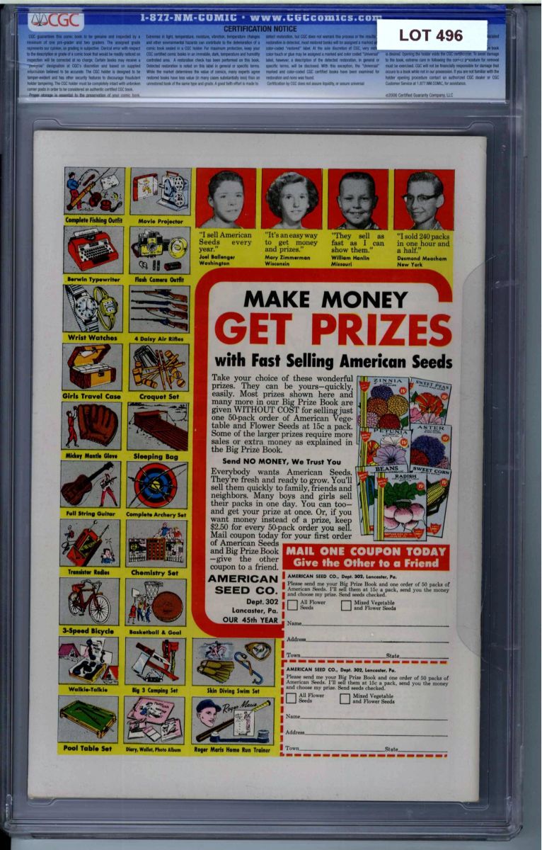 The Auctioneer has reserved the right to reject any and all bids, and to bid at the auction. Auctioneers Auctions are not on approval. Auctioneer does not allow certified material to be returned because of possible differences of opinion with respect to the grade offered by any third party organization, dealer, or service. Absolutely no guarantee of grade is offered for un-certified property sold and subsequently submitted to a third-party grading service. There will be no exceptions to this policy. Under extremely limited circumstances, (e.g. gross cataloging error) a purchaser, who did not bid from the floor, may request Auctioneer to evaluate voiding a sale; such request must be made in writing detailing the alleged gross error, and submission of the lot to the Auctioneer must be pre-approved by the Auctioneer. Bidder must notify Auctioneer in writing of such request within three (3) days of the non-floor bidder receipt of the lot. Any lot that is to be evaluated must be in our offices within 30 days after Auction. Grading does not qualify for this evaluation process nor do such complaints constitute a basis to challenge the authenticity of a lot. AFTER THAT 30-DAY PERIOD, NO LOTS MAY BE RETURNED FOR REASONS OTHER THAN AUTHENTICITY. Lots returned must be housed intact in the original holder. No lots purchased by floor Bidders may be returned (including those Bidders acting as agents for others). Late remittance for purchases may be considered just cause to revoke all return privileges. B: Auctions conducted solely on the Internet have a THREE (3) DAY RETURN POLICY: Lots paid for within seven days of the Auction closing are sold with a three (3) day return privilege. You may return lots under the following conditions: Within three days of receipt of the lot, you must first notify Auctioneer by contacting Client Service by phone (314-680-8599) or e-mail (moundcityauctions@gmail.com), and immediately mail the lot(s) fully insured to the attention of Returns, Mound City Auctions 1081 Teson Rd. Hazelwood, MO. 63042. Lots must be housed intact in their original holder and in their original condition. You are responsible for the insured, safe delivery of any lots. Auctioneer will not be responsible for lots returned in non-registered mail or lots returned without prior authorization per section B. A non-negotiable return fee of 5% of the purchase price ($10 per lot minimum) will be deducted from the refund for each returned lot or billed directly. Postage and handling fees are not refunded. After the three-day period (from receipt), no items may be returned for any reason. Late remittance for purchases revokes all Return-Restock privileges. C: Bidders who have inspected the lots prior to the auction will not be granted any return privileges. D: Comic books sold referencing a third-party grading service are sold “as is” without any express or implied warranty. Certain warranties may be available from the grading services and the Bidder is referred to them for further details: Certified Guaranty Company, LLC. (CGC), P.O. Box 4738, Sarasota, FL 34230. E: Bidders who intend to challenge authenticity or provenance of a lot must notify Auctioneer in writing within thirty (30) days of the Auctions conclusion. In the event Auctioneer cannot deliver the lot or subsequently it is established that the lot lacks title, provenance, authenticity, or other transfer or condition issue is claimed, Auctioneer's liability shall be limited to rescission of sale and refund of purchase price; in no case shall Auctioneer's maximum liability exceed the high bid on that lot, which bid shall be deemed for all purposes the value of the lot. After one year has elapsed, Auctioneer's maximum liability shall be limited to any commissions and fees Auctioneer earned on that lot. F: All comics are guaranteed genuine, but are not guaranteed as to grade, since grading is a matter of opinion, an art and not a science, and therefore the opinion rendered by the Auctioneer or any third party grading service may not agree with the opinion of others (including trained experts), and the same expert may not grade the same item with the same grade at two different times. G: Since we cannot examine encapsulated comics, they are sold “as is”without our grading opinion, and may not be returned for any reason. Auctioneer shall not be liable for any patent or latent defect or controversy pertaining to or arising from any encapsulated collectible. In any such instance, purchaser's remedy, if any, shall be solely against the service certifying the collectible. H: Due to changing grading standards over time, differing interpretations, and to possible mishandling of items by subsequent owners, Auctioneer reserves the right to grade items differently than shown on certificates from any grading service that accompany the items. Auctioneer also reserves the right to grade items differently than the grades shown in the prior catalog should such items be reconsigned to any future auction. I: Although consensus grading is employed by most grading services, it should be noted as aforesaid that grading is not an exact science. In fact, it is entirely possible that if a lot is broken out of a plastic holder and resubmitted to another grading service or even to the same service, the lot could come back with a different grade assigned. J: Certification does not guarantee protection against the normal risks associated with potentially volatile markets. The degree of liquidity for certified collectibles will vary according to general market conditions and the particular lot involved. For some lots there may be no active market at all at certain points in time."
