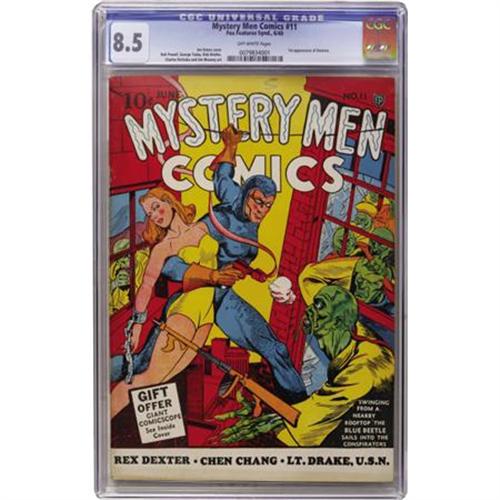 <B>Mystery Men Comics #11 (Fox, 1940) CGC VF+ 8.5 Off-white pages.</B></I> This well-preserved copy was barely nudged out as the finest specimen that CGC has seen to date of #11. The distinctive cover is by Joe Simon, while inside, Bob Powell, Charles Nicholas, Dick Briefer, George Tuska, and Jim Mooney drew the stories. The issue had the first appearance of Domino. Overstreet 2007 VF 8.0 value = $625; VF/NM 9.0 value = $1,013. CGC census 5/07: 2 in 8.5, 2 higher.<BR><BR><b>Shipping:</b> Comics - Slabbed (certified) (<a target="_blank" href="http://www.heritageauctions.com/common/shipping.php">view shipping information</a>)