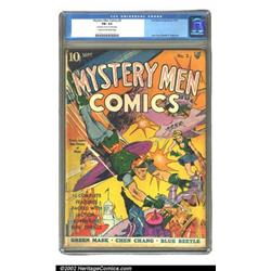 Mystery Men Comics #2 (Fox, 1939) CGC FN- 5.5 Cream to off-white pages. This is another one of a very small selection of early Fox Lou Fine comics that we at Heritage are pleased to offer in this auction. Lou Fine's Fox comics are earlier and scarcer than his work for Quality comics, and much more prized by advanced Lou Fine collectors. Mystery Men #2 is an excellent example of his work, demonstrating his mastery of the three R's of science fiction: ray-guns, robots, and rocket ships. In fact, this ties for the second use of robots on a comic book cover! The stories inside are by such notable artists as Bob Powell and George Tuska. This copy does suffer from a spine roll and foxing, but that just makes it easier for the average working stiff to be able to get a copy of such a cool and rare book. CGC states, "Small stain on top of a few pages." Overstreet 2002 FN 6.0 value = $924. Important notice: We expect to be auctioning lots at the rate of 200-250 per hour. Sometimes eBay Premier live bid software cannot keep up with that pace, so we strongly recommend that you place a realistic proxy bid now as insurance to avoid disappointment. Also please note that all Heritage/CAA lots purchased through eBay Premier carry a 20% Buyer's Premium. Please make sure you read the Terms and Conditions.