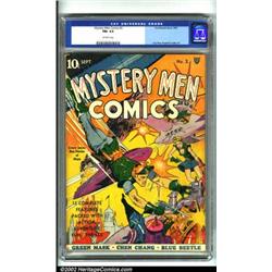 Mystery Men Comics #2 (Fox, 1939). Early Fox comics are extremely scarce and highly desirable. This is one tremendous comic book with a classic Lou Fine robot cover, which Overstreet lists as the second robot cover in comics. A fun issue that includes the second appearance of the Blue Beetle, the star of the Fox lineup. Also featured in this issue are the Green Mask and Chen Chang. This copy is aesthetically pleasing as well, with very good color and only light to moderate wear. The pages are above average for an early Fox title. The letter "S" is written in grease pencil on the cover (no label note), and has been partially erased. CGC FN+ 6.5 Off-white pages. Overstreet 2001 FN 6.0 value = $915. Important notice: We expect to be auctioning lots at the rate of 200-250 per hour. Sometimes eBay Premier live bid software cannot keep up with that pace, so we strongly recommend that you place a realistic proxy bid now as insurance to avoid disappointment. Also please note that all Heritage/CAA lots purchased through eBay Premier carry a 20% Buyer's Premium.