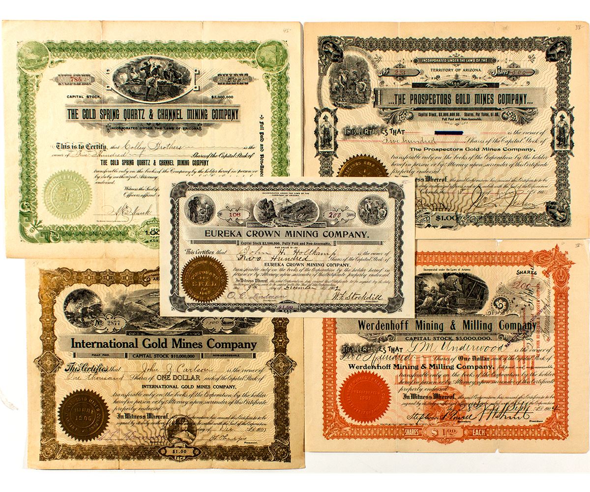 Five certificates. The Cold Springs Quartz & Channel MIning Company, The Prospectors Gold Mines Company, Werdenhoff Mining & Milling Company, International Gold Mines Company, Eureka Crown Mining Company. (Prag Collection)