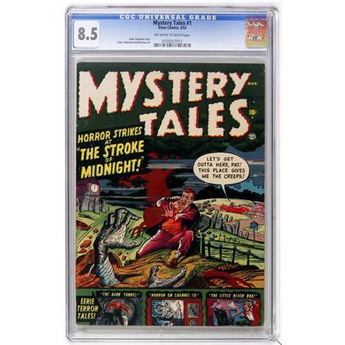 <B>Mystery Tales #1 (Atlas, 1952) CGC VF+ 8.5 Off-white to white pages.</B></I> The Overstreet listing for this title mentions "Horror/weird stories in all," and we have to say that this opening issue's graveyard cover scene is indeed pretty weird and horrible! Gene Colan and Joe Maneely are among the artists in this neat pre-Code thriller. Overstreet 2006 VF 8.0 value = $544; VF/NM 9.0 value = $860. CGC census 3/07: 2 in 8.5, 1 higher.<BR><BR><b>Shipping:</b> Comics - Slabbed (certified) (<a target="_blank" href="http://www.heritageauctions.com/common/shipping.php">view shipping information</a>)