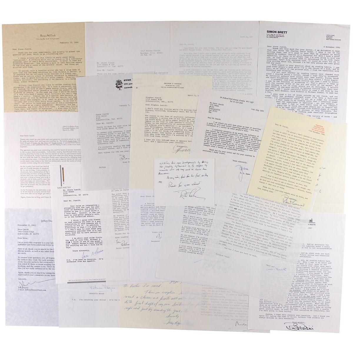 Outstanding collection of 24 letters from mystery authors, most with excellent literary content, primarily consisting of TLSs. Signers are: Robert Barnard, Jon L. Breen, Simon Brett, Rex Burns, Mary Higgins Clark (ALS), Anna Clarke, Jeffery Deaver, Thomas Disch, Margaret Drabble, Loren Estleman, Nicolas Freeling, William Gault, Joseph Hansen, George V. Higgins, Ed Hoch, Evan Hunter, P. D. James, Peter Lovesey, Robert Ludlum (ALS), Patricia Moyes, Robert B. Parker, Sara Paretsky, Bill Pronzini, and Peter Straub (ALS). Ludlum’s letter, in part: “I, too, rarely read fiction…mainly due to the unconscious—or subconscious—‘borrowing’ of another writer’s elements.” Other authors discuss similar issues regarding reading and other authors, as well as various aspects of their style or writing process. In overall fine condition.