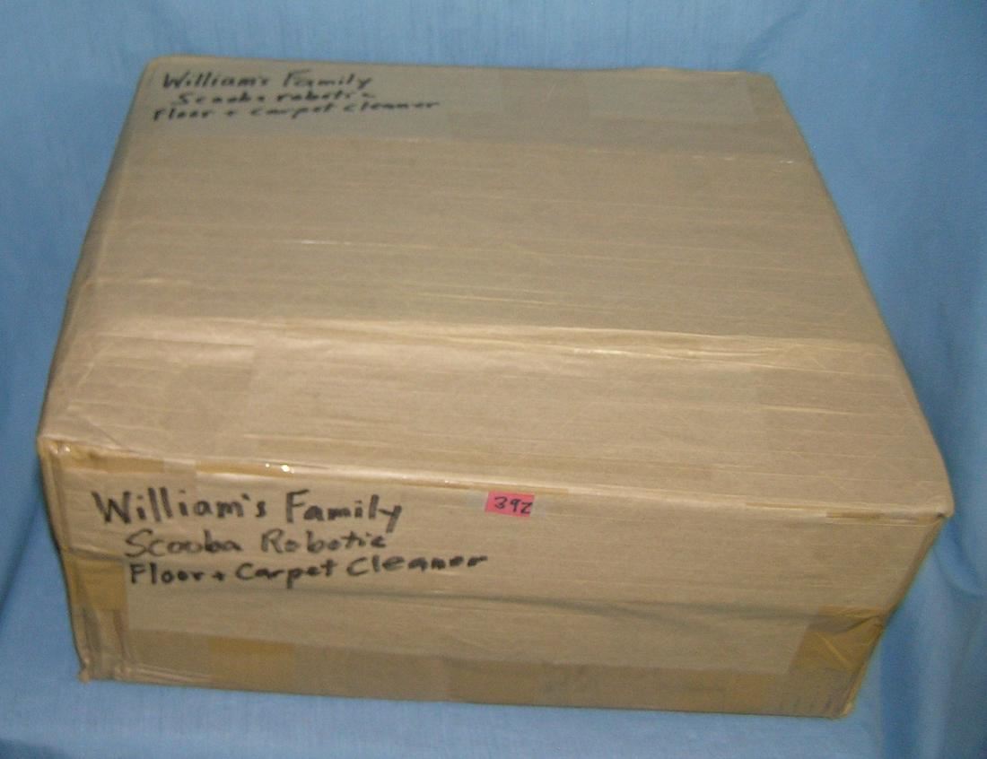 Moving and storage company mystery box lot marked William's family Scooba robotic floor and carpet cleaner est. value $75.00-80.00