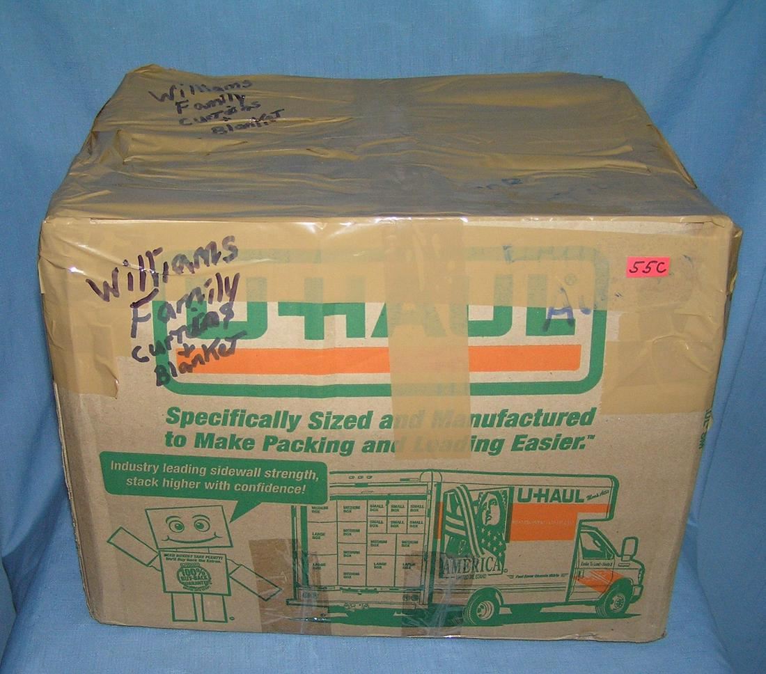 Moving and storage company mystery box lot marked curtains and blanket part of a moving and storage company siezed merchandise liquidation est. value $50.00-$60.00
