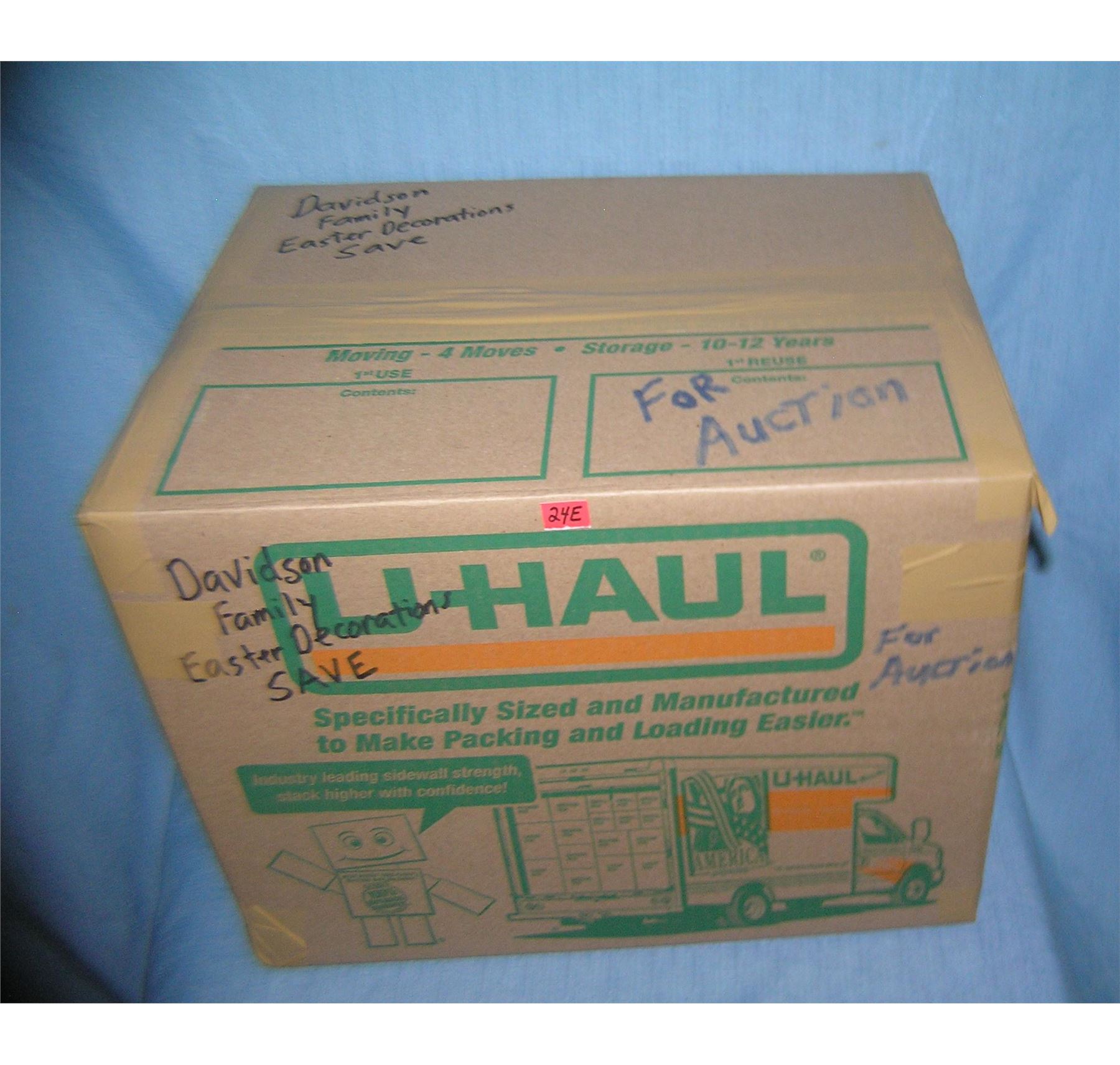 Mystery moving and storage Co. box lot marked Davidson family Easter decorations part of a moving and storage company seized or unclaimed merchandise group sent to auction for liquidation est. value $40.00-$50.00