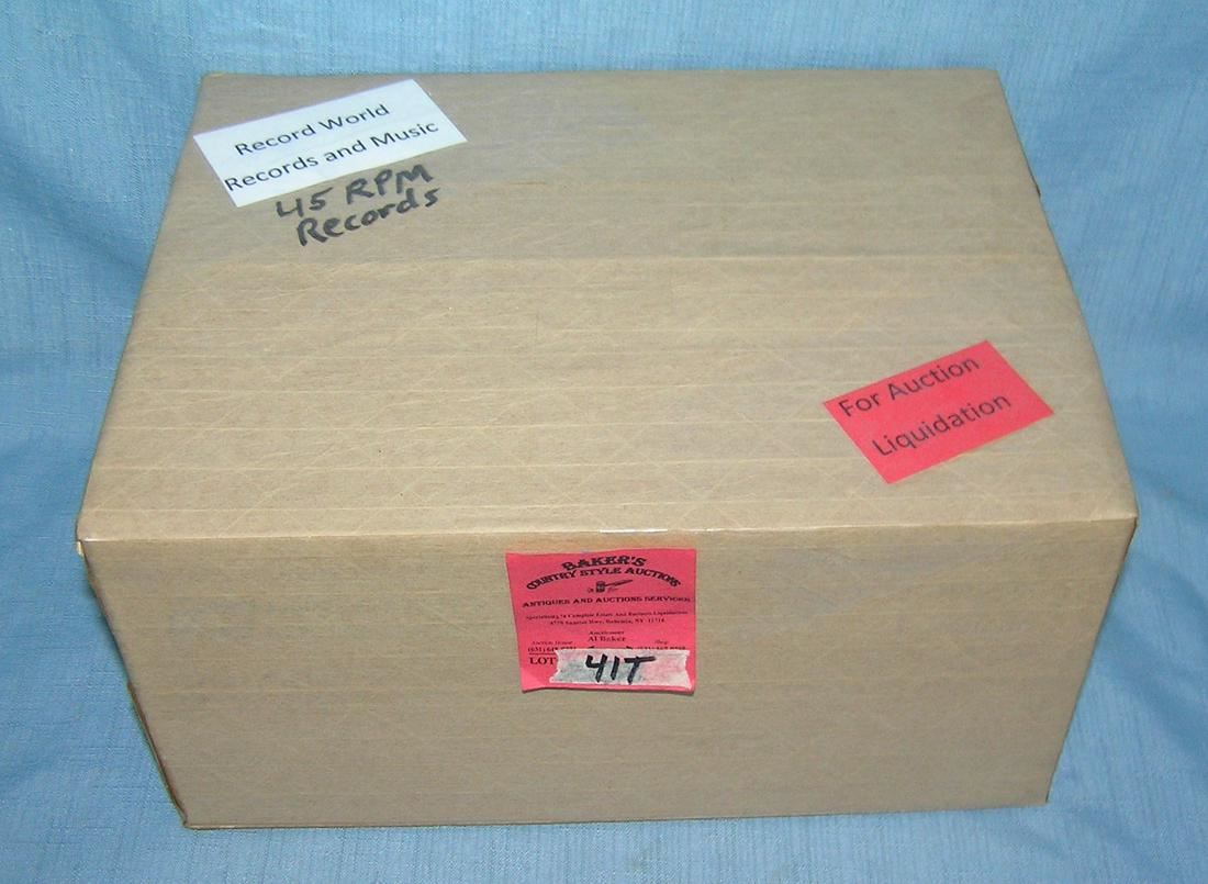 Moving and Storage Company mystery box lot marked Record World records and Music 45 RPM records part of a moving and storage company seized or unclaimed merchandise group sent to auction for liquidation contents removed from an old Long Island record store est. value $50.00-60.00