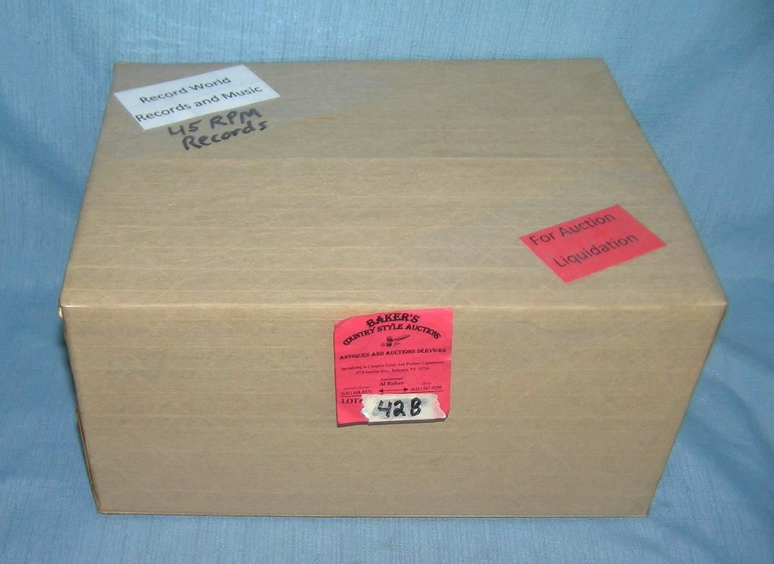 Moving and Storage Company mystery box lot marked Record World records and Music 45 RPM records part of a moving and storage company seized or unclaimed merchandise group sent to auction for liquidation contents removed from an old Long Island record store est. value $50.00-60.00