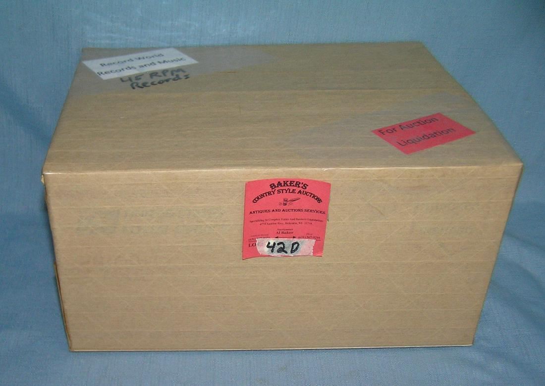 Moving and Storage Company mystery box lot marked Record World records and Music 45 RPM records part of a moving and storage company seized or unclaimed merchandise group sent to auction for liquidation contents removed from an old Long Island record store est. value $50.00-60.00
