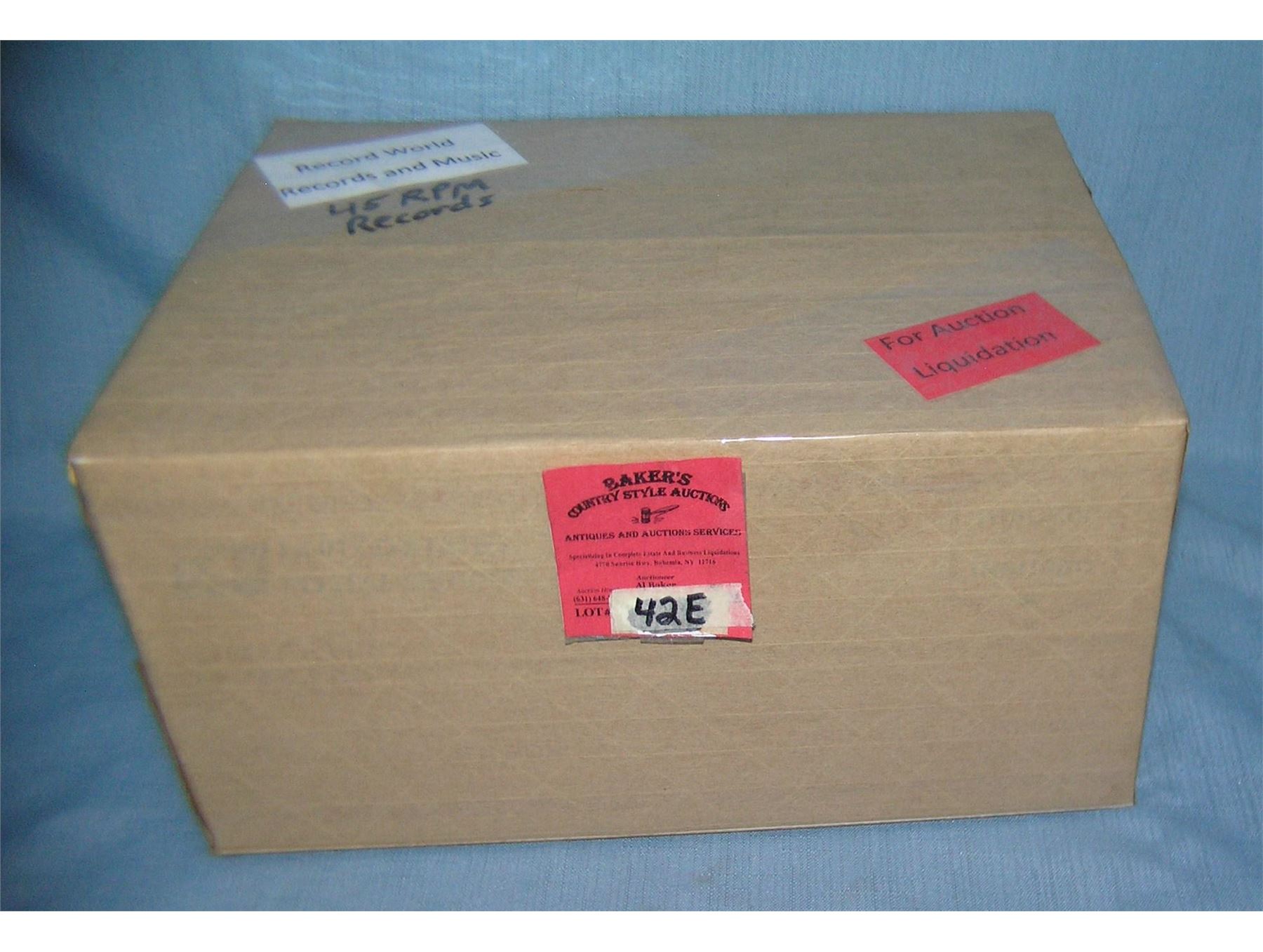 Moving and Storage Company mystery box lot marked Record World records and Music 45 RPM records part of a moving and storage company seized or unclaimed merchandise group sent to auction for liquidation contents removed from an old Long Island record store est. value $50.00-60.00
