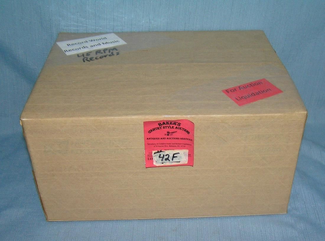Moving and Storage Company mystery box lot marked Record World records and Music 45 RPM records part of a moving and storage company seized or unclaimed merchandise group sent to auction for liquidation contents removed from an old Long Island record store est. value $50.00-60.00