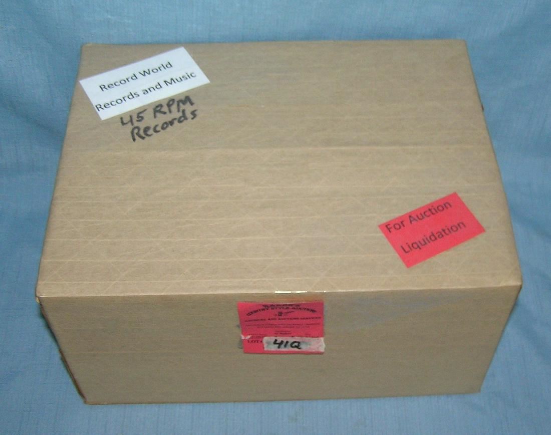 Moving and Storage Company mystery box lot marked Record World records and Music 45 RPM records part of a moving and storage company seized or unclaimed merchandise group sent to auction for liquidation contents removed from an old Long Island record store est. value $50.00-60.00