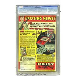 <B>Mystery in Space #2 (DC, 1951) CGC VF- 7.5 White pages.</B></I> Holy crossover! This attractive and colorful cover manages to mix two popular genres into one, with a space Western saga "Jesse James, Highwayman of Space"! This nice copy of an early pre-Code issue of DC's popular science fiction series, featuring art by Murphy Anderson and Carmine Infantino, is notable for great cover color and fresh, white interior pages. Overstreet 2004 VF 8.0 value = $757. <BR><BR><B>Important notice:</B> Heritage usually auctions material at the rate of 200-250 lots per hour. On some occasions eBay Live bid software or the Internet may not be able to keep up with the pace of the auction. We recommend placing a realistic absentee bid now as insurance to avoid disappointment. Occasionally the auctioneer may eliminate or reject an eBay Live bid, and the auctioneer may also reopen a lot after the close of the eBay live bidding (usually because we missed an audience bid), and may reject your bid even if it shows you as the winning bidder. By bidding via eBay Live, you agree that Heritage may award the lot to another bidder at its sole discretion under the circumstances described above or any other reasonable circumstances. Since eBay bids are not shown to us until we open the lot on the floor, we treat those bids just like floor bids. In most cases the floor responds before the eBay bid is presented to us, due to Internet lag time, so for consistency we have made it a policy that floor bids are always considered first over tie eBay live bids. Also please note that all Heritage lots purchased through eBay Live carry a 20% Buyer's Premium. Please make sure you read the Terms and Conditions before you bid.