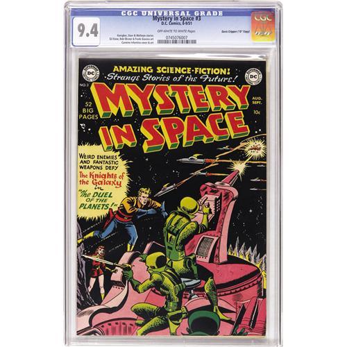 <B>Mystery in Space #3 Davis Crippen ("D" Copy) pedigree (DC, 1951) CGC NM 9.4 Off-white to white pages.</B></I> Simply sumptuous copy of the third issue of DC's early space-theme title. Carmine Infantino came into his own on <B>Mystery In Space</B></I> covers and interior stories, years before his classic work on Adam Strange and on the Flash. Additional art is provided by Gil Kane and Bob Oksner. Overstreet 2006 NM- 9.2 value = $1,425. CGC census 7/06: 1 in 9.4, none higher. <I>From the Crippen Collection</B></I>. <BR><BR><B>Important notice:</B> Heritage usually auctions material at the rate of 200-250 lots per hour. On some occasions eBay Live bid software or the Internet may not be able to keep up with the pace of the auction. We recommend placing a realistic absentee bid now as insurance to avoid disappointment. Occasionally the auctioneer may eliminate or reject an eBay Live bid, and the auctioneer may also reopen a lot after the close of the eBay live bidding (usually because we missed an audience bid), and may reject your bid even if it shows you as the winning bidder. By bidding via eBay Live, you agree that Heritage may award the lot to another bidder at its sole discretion under the circumstances described above or any other reasonable circumstances. Since eBay bids are not shown to us until we open the lot on the floor, we treat those bids just like floor bids. In most cases the floor responds before the eBay bid is presented to us, due to Internet lag time, so for consistency we have made it a policy that floor bids are always considered first over tie eBay live bids. Also please note that all Heritage lots purchased through eBay Live carry a 22.5% Buyer's Premium. Please make sure you read the Terms and Conditions before you bid. This lot is being auctioned in conjunction with a live floor auction by Heritage Auction Galleries. All final auction and invoice information will be supplied by Heritage Auction Galleries, and all other information should be considered preliminary. Lot:41001 <BR><BR><B>Winning Notification and Billing:</B> After the FINAL session in this auction is complete, Heritage will send e-mail and snail mail invoices. This process normally takes several days. All final auction and invoice information will be supplied by Heritage Auction Galleries, and all other information should be considered preliminary. <BR><BR>This auction will be conducted on a live auction floor and over the Internet through eBay Live. If you choose to place an absentee bid, please take a moment to <font color='#0000ff'><u><a href='http://pages.ebay.com/liveauctions/help/before/laabsentee.html'>learn how eBay Live absentee bidding works</a></u></font><font color='#000000'>