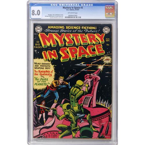 <B>Mystery in Space #3 (DC, 1951) CGC VF 8.0 Off-white pages.</B></I> A very nice copy of the third issue of DC's early space-themed title. Carmine Infantino had a wonderful "almost 3-D" effect for his <B>Mystery In Space</B></I> covers and interior stories. Years later his work on Adam Strange and the Flash would become classics. Additional art is provided by Gil Kane and Bob Oksner. Overstreet 2006 VF 8.0 value = $604. CGC census 3/07: 5 in 8.0, 6 higher.<BR><BR><b>Shipping:</b> Comics - Slabbed (certified) (<a target="_blank" href="http://www.heritageauctions.com/common/shipping.php">view shipping information</a>)