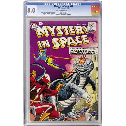 <B>Mystery in Space #55 (DC, 1959) CGC VF 8.0 Off-white to white pages.</B></I> We're not surprised that this is the highest-graded copy -- this issue just never shows up in high grade because that purple cover background is so unforgiving when it comes to color breaks. Gil Kane drew the incredible grey tone cover for this book, the third Adam Strange issue of the series. Overstreet 2006 VF 8.0 value = $285. CGC census 3/07: 1 in 8.0, none higher. <I> From the Warren Hall Collection.</B></I><BR><BR><b>Shipping:</b> Comics - Slabbed (certified) (<a target="_blank" href="http://www.heritageauctions.com/common/shipping.php">view shipping information</a>)