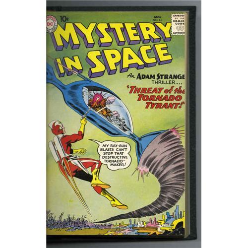 <B>Mystery in Space #61-80 Bound Volume (DC, 1960-62).</B></I> The further adventures of Adam strange are presented here, including a crossover with the Justice League of America, with art by Carmine Infantino, Gil Kane, and Murphy Anderson. The covers are mostly in great shape with only the occasional crease or small stain, as are the pages, which range from off-white to light tan. The books are bound in a dark green leather-style cover, with the title and issue numbers embossed on the spine, and all have been trimmed as part of the binding process. Overstreet 2005 VG 4.0 value for group = $638.