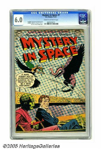 <B>Mystery in Space #7 (DC, 1952) CGC FN 6.0 Cream to off-white pages.</B></I> Early issue of the title impresses with a Gil Kane cover, and art by Alex Toth, Carmine Infantino, Murphy Anderson, and John Giunta. Overstreet 2005 FN 6.0 value = $144. CGC census 3/05: 1 in 6.0, 6 higher. <I>From the Northern Lights Collection</B></I>.