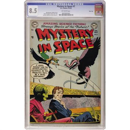 <B>Mystery in Space #7 River City pedigree (DC, 1952) CGC VF+ 8.5 Off-white pages.</B></I> A story drawn by Alex Toth is the highlight of this science fiction book, but the other artists involved are no slouches, with Gil Kane (cover), Carmine Infantino, Murphy Anderson, and John Giunta all contributing. Overstreet 2007 VF 8.0 value = $384; VF/NM 9.0 value = $647. CGC census 6/07: 2 in 8.5, 1 higher. <I> From the Keith Marlow Collection.</B></I><BR><BR><b>Shipping:</b> Comics - Slabbed (certified) (<a target="_blank" href="http://www.heritageauctions.com/common/shipping.php">view shipping information</a>)