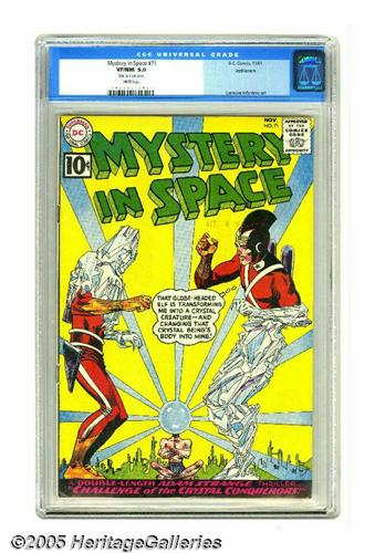 <B>Mystery in Space #71 Bethlehem pedigree (DC, 1961) CGC VF/NM 9.0 White pages.</B></I> Carmine Infantino art. CGC notes, "Date stamp on cover." Overstreet 2005 VF/NM 9.0 value = $193; NM- 9.2 value = $260. CGC census 3/05: 1 in 9.0, none higher.
