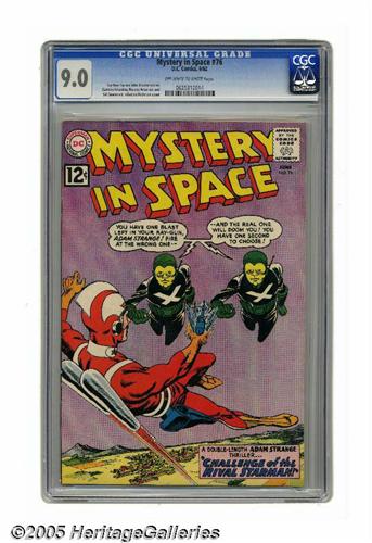 <B>Mystery in Space #76 (DC, 1962) CGC VF/NM 9.0 Off-white to white pages.</B></I> Carmine Infantino and Murphy Anderson cover and art. Overstreet 2005 VF/NM 9.0 value = $134; NM- 9.2 value = $180. CGC census 3/05: 1 in 9.0, 3 higher. <I>From the Northern Lights Collection.</B></I>