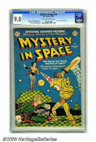 <B>Mystery in Space #8 (DC, 1952) CGC VF/NM 9.0 Off-white to white pages.</B></I> Carmine Infantino created a doozy of a cover for this issue, and also drew the Knights of the Galaxy feature, the last one in the series. Murphy Anderson and Bob Oksner provided additional interior art. CGC has awarded a higher grade to just one other copy of #8. Overstreet 2005 VF/NM 9.0 value = $605; NM- 9.2 value = $825. CGC census 3/05: 1 in 9.0, 1 higher. <I>From the Northern Lights Collection</B></I>.