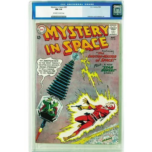 <B>Mystery in Space #83 (DC, 1963) CGC NM 9.4 Off-white to white pages.</B></I> Adam Strange benefited from the artistic talents of Carmine Infantino and Murphy Anderson here. Overstreet 2006 NM- 9.2 value = $150. CGC census 4/06: 2 in 9.4, 1 higher.