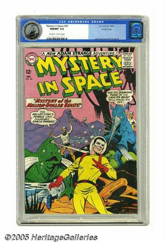 <B>Mystery in Space #96 Pacific Coast pedigree (DC, 1964) CGC NM/MT 9.8 Off-white to white pages.</B></I> Like so many copies from this pedigree, this is easily the nicest copy CGC has certified to date. Beautiful colors leap off the Space Ranger cover by Howard Purcell. Purcell and Lee Elias provide interior art. Overstreet 2005 NM- 9.2 value = $80. CGC census 3/05: 1 in 9.6, none higher.