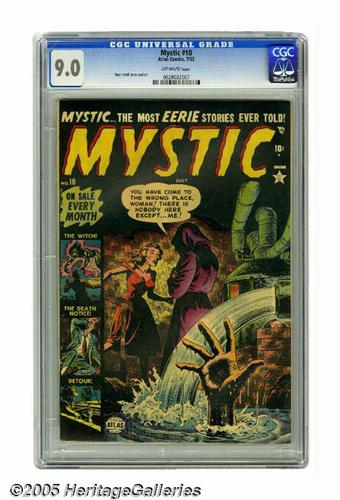<B>Mystic #10 (Atlas, 1952) CGC VF/NM 9.0 Off-white pages.</B></I> Russ Heath cover and art. Overstreet 2005 VF/NM 9.0 value = $287; NM- 9.2 value = $385. CGC census 5/05: 1 in 9.0, none higher.