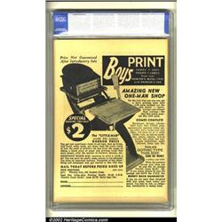 Mystic Comics #1 Allentown pedigree (Timely, 1940) CGC NM- 9.2 Off-white pages. The awesome Alex Schomburg draws this stupendous bondage cover of the Blue Blaze rescuing a wide-eyed buxom woman from a horde of crusty looking cretins. Note the incredible line detail in Schomburg's nefarious characters. Witness the Blue Blaze bloodily pistol-whipping a green-skinned goon, the amputee goon with a hook, and the astonished expression of the one-eyed red-robbed grey-skinned dude as he tries to shoot the Blue Blaze. This issue is spearheaded with appearances of the Blue Blaze, the Dynamic Man, Flexo the Rubber Robot, Zephyr Jones and other Golden Age wonders. This astounding copy features brilliant hues and nice corners. Overstreet 2002 NM 9.4 value = $17,500. Important notice: We expect to be auctioning lots at the rate of 200-250 per hour. Sometimes eBay Premier live bid software cannot keep up with that pace, so we strongly recommend that you place a realistic proxy bid now as insurance to avoid disappointment. Also please note that all Heritage/CAA lots purchased through eBay Premier carry a 20% Buyer's Premium.