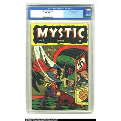 Mystic Comics #1 "D" Copy pedigree (Timely, 1944) CGC NM 9.4 Off-white pages. The Angel interrupts the Nazi interrogation of a bound, but perfectly made-up and nattily dressed beauty, in this first issue of the second series bearing this title. Like the first series, these issues seem to be more difficult to find than other Timelys from the same time period. The "D" Copy pedigree continues to impress with one of only three books in either the first or second series of Mystic Comics to earn a Near Mint designation. The other Near Mints are also courtesy of the pedigree and come in the form of the next two issues, also offered in our auction. Collect all three! Overstreet 2002 NM 9.4 value = $2,500. Important notice: We expect to be auctioning lots at the rate of 200-250 per hour. Sometimes eBay Premier live bid software cannot keep up with that pace, so we strongly recommend that you place a realistic proxy bid now as insurance to avoid disappointment. Also please note that all Heritage/CAA lots purchased through eBay Premier carry a 20% Buyer's Premium. Please make sure you read the Terms and Conditions.