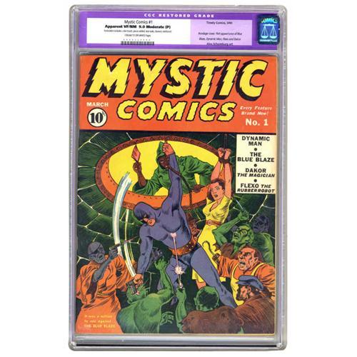<B>Mystic Comics #1 (Timely, 1940) CGC Apparent VF/NM 9.0 Moderate (P) Cream to off-white pages.</B></I> One of Timely's earliest titles showcased some of Alex Schomburg's rawest cover creations. Bondage, point-blank shooting, a superhero battling hordes of goons 'n ghouls, meat cleaver and meat hook as weapons, knives galore - and we haven't opened a page yet! The first appearances of Blue Blaze, Dynamic Man, Flexo, and Dakor are in this issue. This is a Gerber "scarce" issue, and it's downright impossible to find one that looks this nice. Considering that CGC has certified just one unrestored copy of #1 with a grade higher than VF- 7.5, this restored beauty looks even nicer. CGC notes, "Restoration includes: color touch, pieces added, tear seals, cleaned, reinforced." Overstreet 2005 GD 2.0 value = $1,294; VG 4.0 value = $2,588; FN 6.0 value = $3,882; VF 8.0 value = $9,705; VF/NM 9.0 value = $15,853.