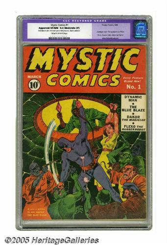 <B>Mystic Comics #1 (Timely, 1940) CGC Apparent VF/NM 9.0 Moderate (P) Cream to off-white pages.</B></I> One of Timely's earliest titles showcased some of Alex Schomburg's rawest cover creations. Bondage, point-blank shooting, a superhero battling hordes of goons 'n ghouls, meat cleaver and meat hook as weapons, knives galore - and we haven't opened a page yet! The first appearances of Blue Blaze, Dynamic Man, Flexo, and Dakor are in this issue. This is a Gerber "scarce" issue, and it's downright impossible to find one that looks this nice. Considering that CGC has certified just one unrestored copy of #1 with a grade higher than VF- 7.5, this restored beauty looks even nicer. CGC notes, "Restoration includes: color touch, pieces added, tear seals, cleaned, reinforced." Overstreet 2005 GD 2.0 value = $1,294; VG 4.0 value = $2,588; FN 6.0 value = $3,882; VF 8.0 value = $9,702; VF/NM 9.0 value = $15,853.