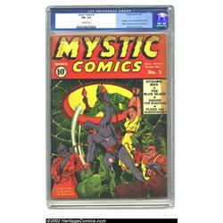 Mystic Comics #1 (Timely, 1940) CGC FN+ 6.5 Off-white pages. Timely/Marvel liked this title so much, they just wouldn't let it die. Three series, beginning in 1940, 1944, and 1951 carried the Mystic logo, but this one is the granddaddy of all Mystics, with a befitting Alex Schomburg bondage cover. The first appearances of the Blue Blaze, the Dynamic Man, Flexo the Rubber Robot, Zephyr Jones, and Dakor the Magician are featured in this scarce issue. There are currently only two unrestored copies of this issue that have been graded higher by CGC. Overstreet 2003 FN 6.0 value = $3,800. Important notice: Heritage usually auctions material at the rate of 200-250 lots per hour. On some occasions eBay Live bid software or the Internet may not be able to keep up with the pace of the auction. We recommend placing a realistic absentee bid now as insurance to avoid disappointment. Occasionally the auctioneer may eliminate or reject an eBay Live bid, and the auctioneer may also reopen a lot after the close of the eBay live bidding (usually because we missed an audience bid), and may reject your bid even if it shows you as the winning bidder. By bidding via eBay Live, you agree that Heritage may award the lot to another bidder at its sole discretion under the circumstances described above or any other reasonable circumstances. Also please note that all Heritage lots purchased through eBay Live carry a 20% Buyer's Premium. Please make sure you read the Terms and Conditions before you bid.