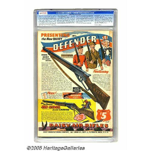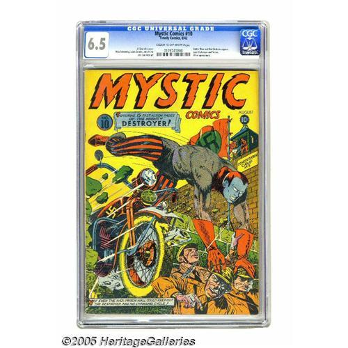 <B>Mystic Comics #10 (Timely, 1942) CGC FN+ 6.5 Cream to off-white pages.</B></I> You gotta love this close-up of all-out Destroyer action, courtesy of Al Gabriele! Inside the issue, there's art by the like of Mike Sekowsky and Don Rico, an appearance of Red Skeleton (not to be confused with Red Skelton), and a Hitler appearance. Overstreet 2005 FN 6.0 value = $669; VF 8.0 value = $1,394. CGC census 7/05: 1 in 6.5, 2 higher. <I>From the Aviator Collection</B></I>. <BR><BR><B>Important notice:</B> Heritage usually auctions material at the rate of 200-250 lots per hour. On some occasions eBay Live bid software or the Internet may not be able to keep up with the pace of the auction. We recommend placing a realistic absentee bid now as insurance to avoid disappointment. Occasionally the auctioneer may eliminate or reject an eBay Live bid, and the auctioneer may also reopen a lot after the close of the eBay live bidding (usually because we missed an audience bid), and may reject your bid even if it shows you as the winning bidder. By bidding via eBay Live, you agree that Heritage may award the lot to another bidder at its sole discretion under the circumstances described above or any other reasonable circumstances. Since eBay bids are not shown to us until we open the lot on the floor, we treat those bids just like floor bids. In most cases the floor responds before the eBay bid is presented to us, due to Internet lag time, so for consistency we have made it a policy that floor bids are always considered first over tie eBay live bids. Also please note that all Heritage lots purchased through eBay Live carry a 20% Buyer's Premium. Please make sure you read the Terms and Conditions before you bid. This lot is being auctioned in conjunction with a live floor auction by Heritage Galleries & Auctioneers. All final auction and invoice information will be supplied by Heritage Galleries & Auctioneers, and all other information should be considered preliminary. Lot:3064 <BR><BR><