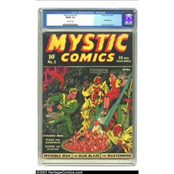 Mystic Comics #2 (Timely, 1940) CGC FN/VF 7.0 Off-white pages. All but two issues of this title's ten-issue run are "uncommon" or "scarce" according to Gerber's The Photo-Journal Guide to Comic Books. What's this? Obscure Timely superheroes? So Dynamic Man, Flexo the Rubberman, Dakor the Magician, Invisible Man, the Blue Blaze, and the Mastermind didn't have the long-running success of Captain America, the Human Torch, Sub-Mariner, the Angel, and others. But these lesser-knowns came first and paved the way, darn it! And the Alex Schomburg bondage cover cannot be criticized! This is the second-nicest copy (only a 7.5 is better) CGC has reviewed of issue #2 to date. Overstreet 2002 FN 6.0 value = $1,250; VF 8.0 value = $2,604. Important notice: We expect to be auctioning lots at the rate of 200-250 per hour. Sometimes eBay Premier live bid software cannot keep up with that pace, so we strongly recommend that you place a realistic proxy bid now as insurance to avoid disappointment. Also please note that all Heritage/CAA lots purchased through eBay Premier carry a 20% Buyer's Premium. Please make sure you read the Terms and Conditions.