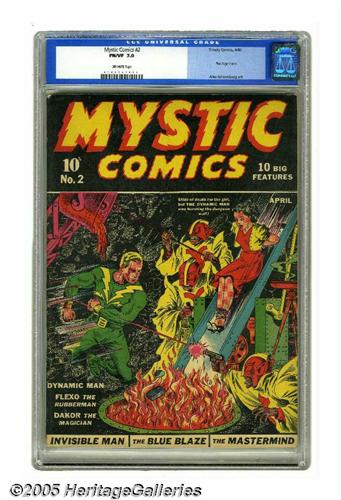 <B>Mystic Comics #2 (Timely, 1940) CGC FN/VF 7.0 Off-white pages.</B></I> Here's a really tough issue to find in high grade. To date, CGC's highest-awarded grade for #2 is VF 8.0, just a tad nicer than our offering here. Alex Schomburg's bondage cover is irresistible! Overstreet 2005 FN 6.0 value = $1,278; VF 8.0 value = $2,982. CGC census 6/05: 1 in 7.0, 2 higher.