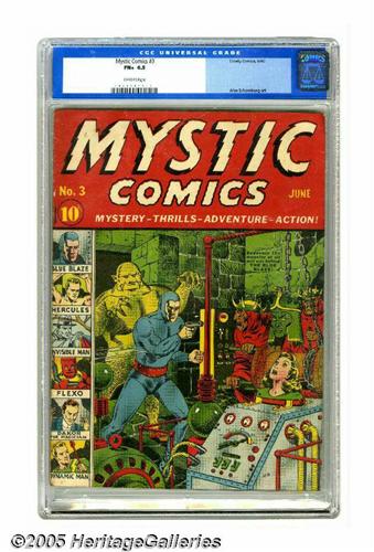 <B>Mystic Comics #3 (Timely, 1940) CGC FN+ 6.5 Off-white pages.</B></I> This early title isn't as easy to find as other Timelys, and much harder to find in high grade. CGC lists four nicer copies, but none with a grade higher than VF+ 8.5. The cover is pure Schomburg, and that's about as good a Golden Age cover as it gets. Overstreet 2005 FN 6.0 value = $951; VF 8.0 value = $2,061. CGC census 6/05: 1 in 6.5, 4 higher.
