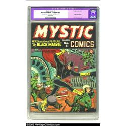 Mystic Comics #5 (Timely, 1941) CGC Apparent FN/VF 7.0 Slight (P) Off-white pages. Timely was still feverishly auditioning superheroes in this issue wherein we find the origins of the Black Marvel, the Blazing Skull, the Sub-Earth Man, Super Slave, and the Terror. German war covers begin with this issue, and the most famous portrayer thereof, Alex Schomburg, does the honors here. CGC notes "Restoration includes: small amount of color touch on cover." That's not much embellishment, and technically this is the fourth-nicest copy of the issue that CGC has reviewed to date. Overstreet 2002 FN 6.0 value = $900; VF 8.0 value = $1,875. Important notice: We expect to be auctioning lots at the rate of 200-250 per hour. Sometimes eBay Premier live bid software cannot keep up with that pace, so we strongly recommend that you place a realistic proxy bid now as insurance to avoid disappointment. Also please note that all Heritage/CAA lots purchased through eBay Premier carry a 20% Buyer's Premium. Please make sure you read the Terms and Conditions.